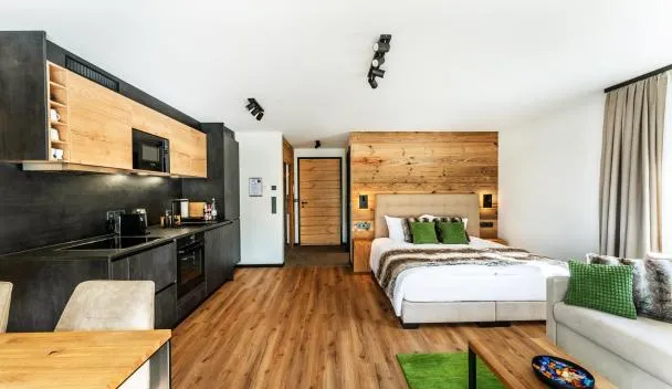 Freuen Sie sich auf einen kostenfreien Innenpool und eine Sauna, einen eigenen Garten und Apartments im modernen Stil mit einem Balkon.